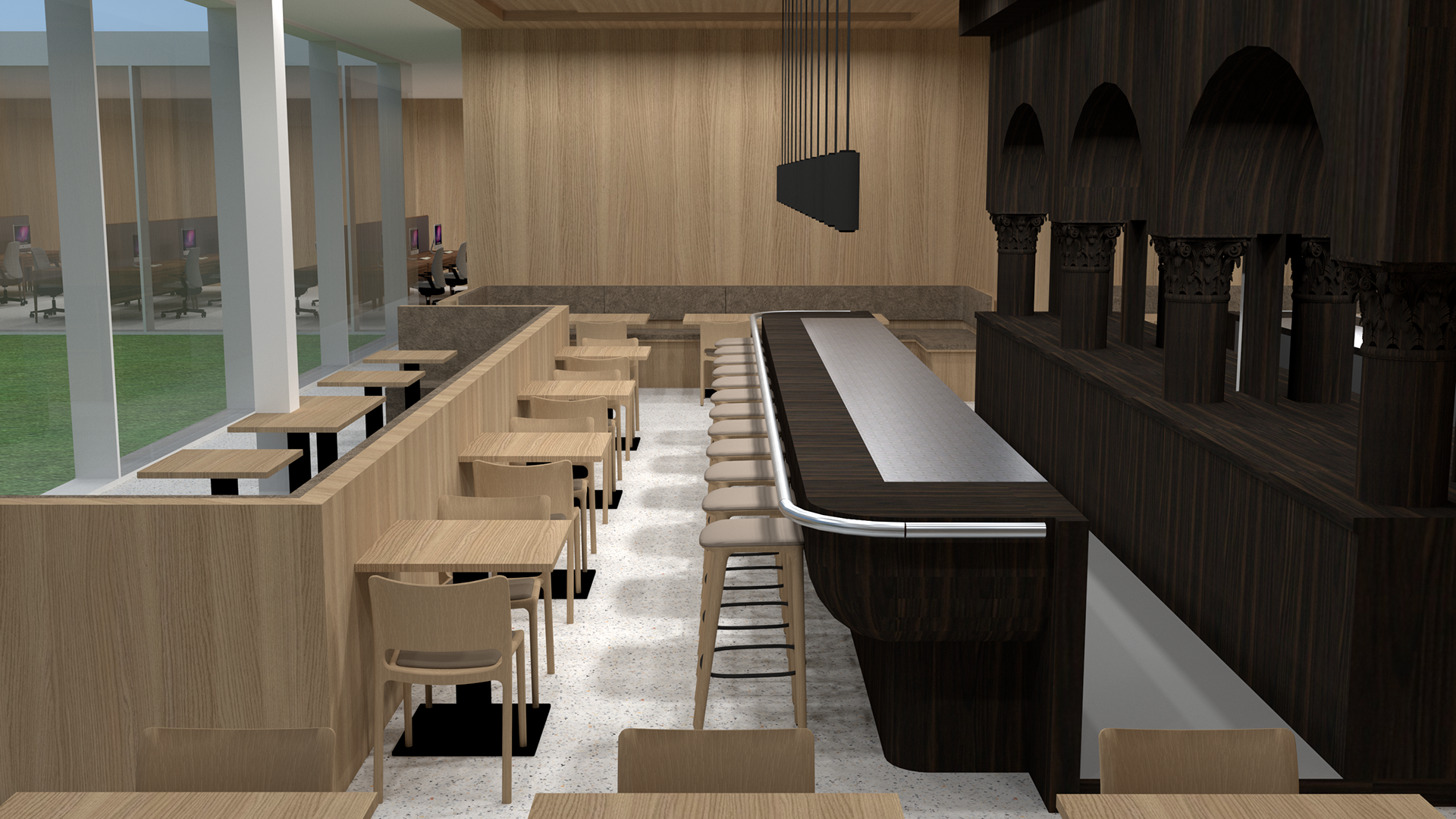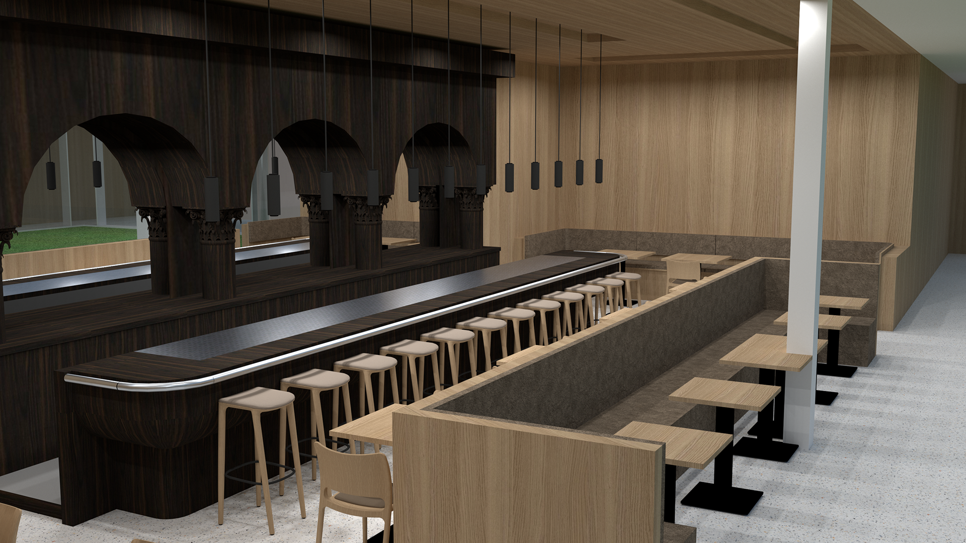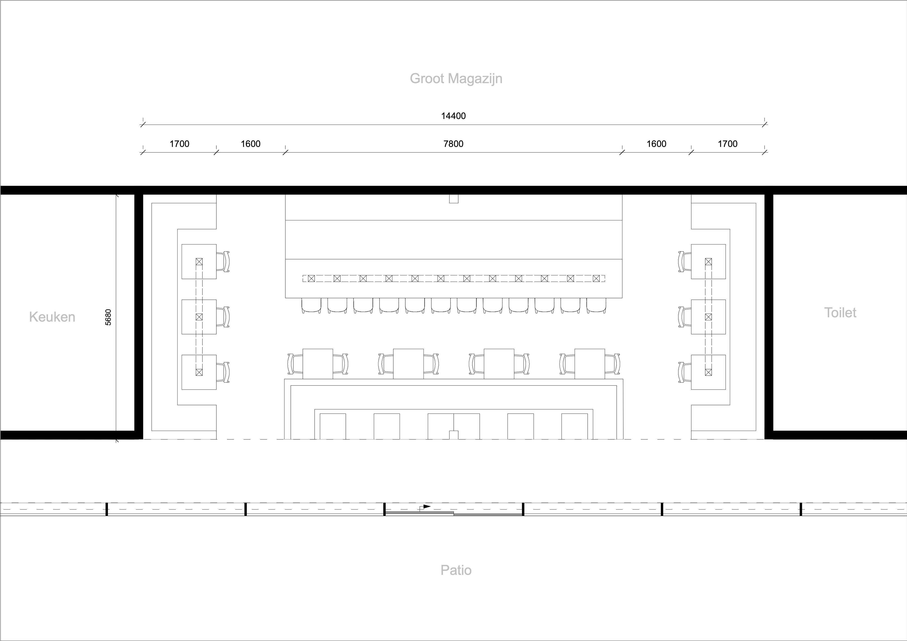 De ruimte is eenvoudig qua opzet. Links en recht vaste banken met kleine tafels. Centraal ook een vaste bank gericht op de patio. Achter de bank een rij kleine tafels.